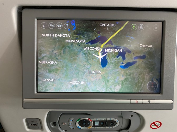 This morning was quite nice and calm, other than having to say goodbye to Sarah-Ann, my fiancé. Oh yes, that’s right – I’m engaged now 😁. No issues getting onto the flight, and now here I am – currently somewhere over Lake Michigan.